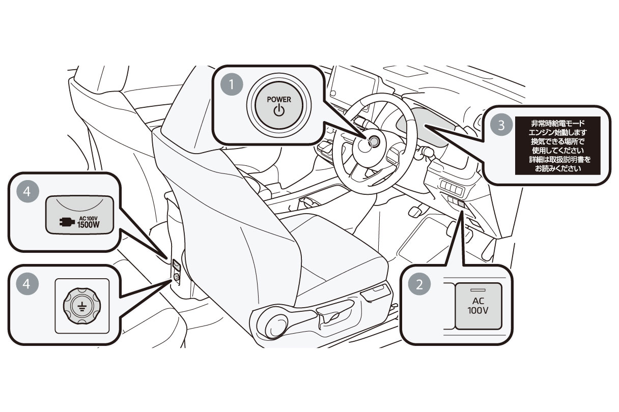 コンセント(AC100V・1500W)を、センターコンソール後部に設置。非常時給電システムを使用することで、災害などによる非常時に電力が必要な時、車両の走行機能を停止した状態で、AC100Vで消費電力の合計が1500W以下の電気製品を使用できます。