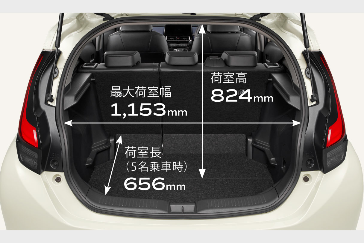 ■標準状態以外のシートアレンジにすると走行できない場合や、ご注意いただきたい項目があります。必ず取扱説明書をご覧ください。■積載物のサイズや形状によっては入らない場合や、ご注意いただきたい項目があります。■走行時には、後方視界確保、荷物の転倒防止にご留意ください。